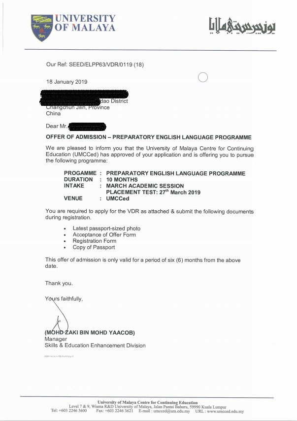 馬來西亞錄取通知書