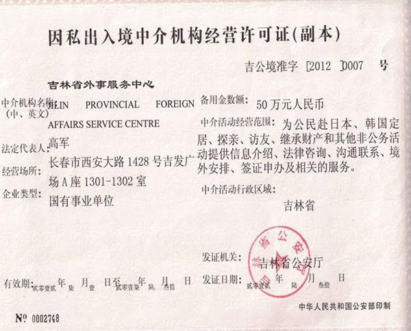 因私出入境中介機(jī)構(gòu)經(jīng)營(yíng)許可證(副本)